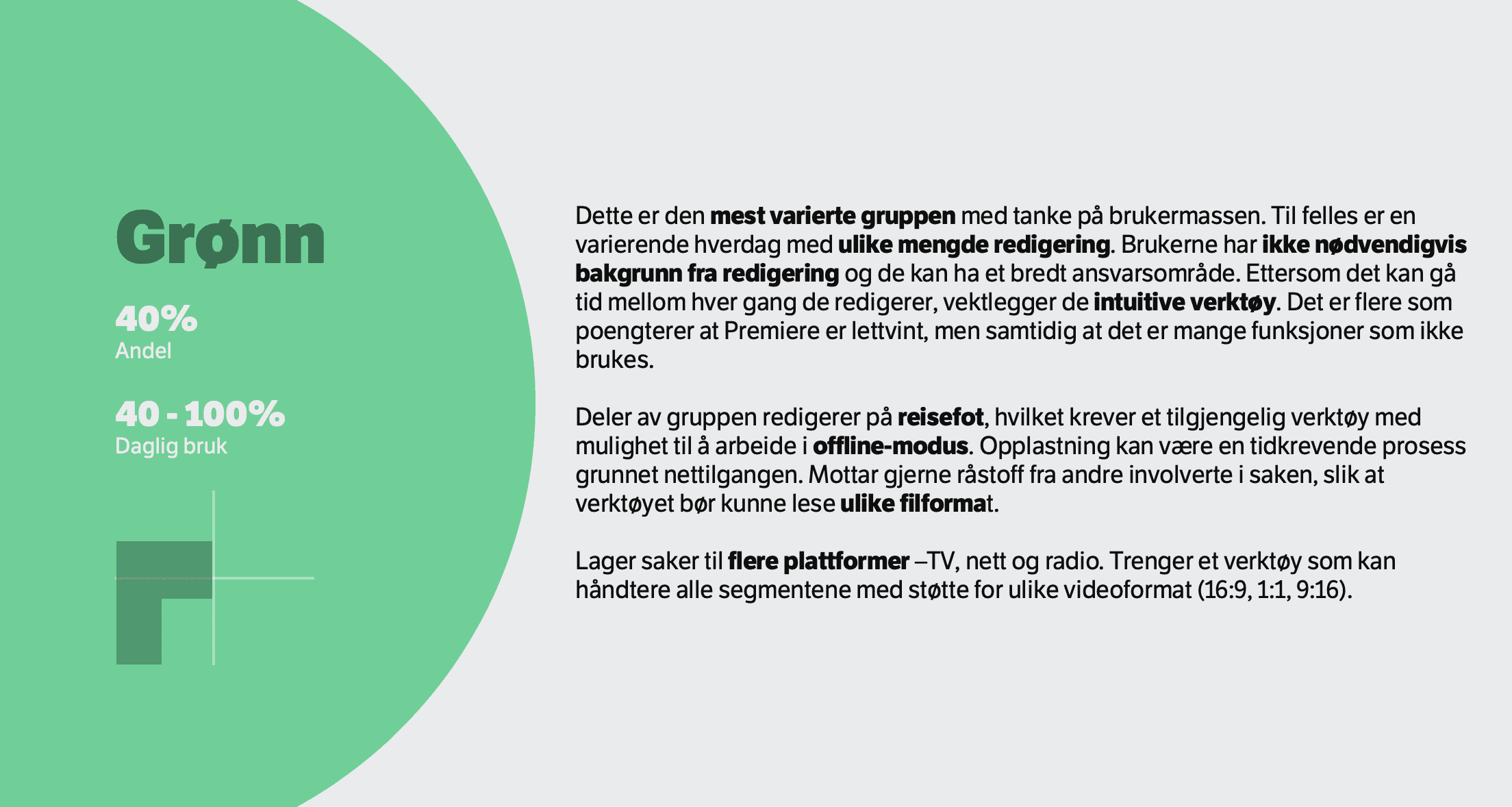 I led an insight project for NRK aimed at understanding how their employees use video editing tools across various departments. Working alongside an NRK video editor, we traveled to different locations across Norway, conducting interviews and observing employees in their daily workflow. We used both qualitative and quantitative methods to gather data, sitting with users to understand what worked well and what needed improvement. Although the primary goal was to gain insight into the use of video editing tools, we also uncovered broader findings related to NRK's cross-departmental work processes. These insights were critical in identifying opportunities for streamlining workflows and improving collaboration. Our findings were thoroughly documented and presented to the organization, offering recommendations for optimizing both the tools and the workflows.